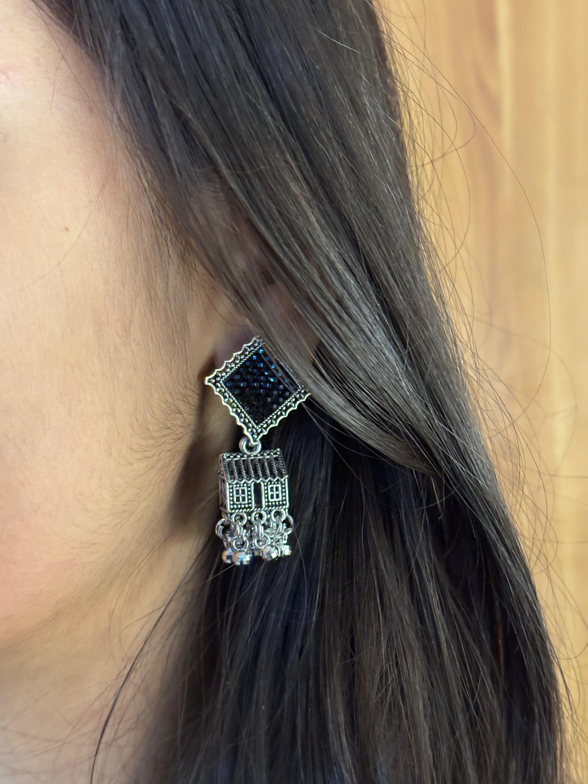 - Oxidised square jhumka earrings β Square oxidised stud with layered dangling bead elements.